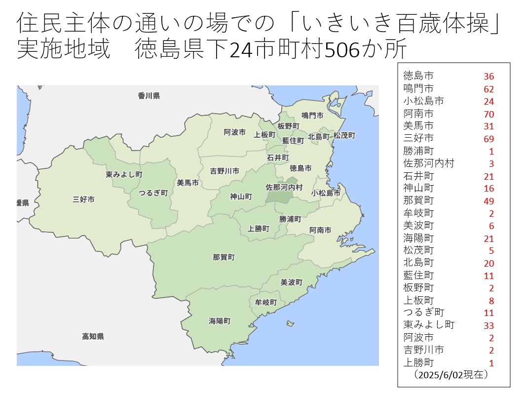 徳島県下でいきいき百歳体操」を実施している地域を示しています。